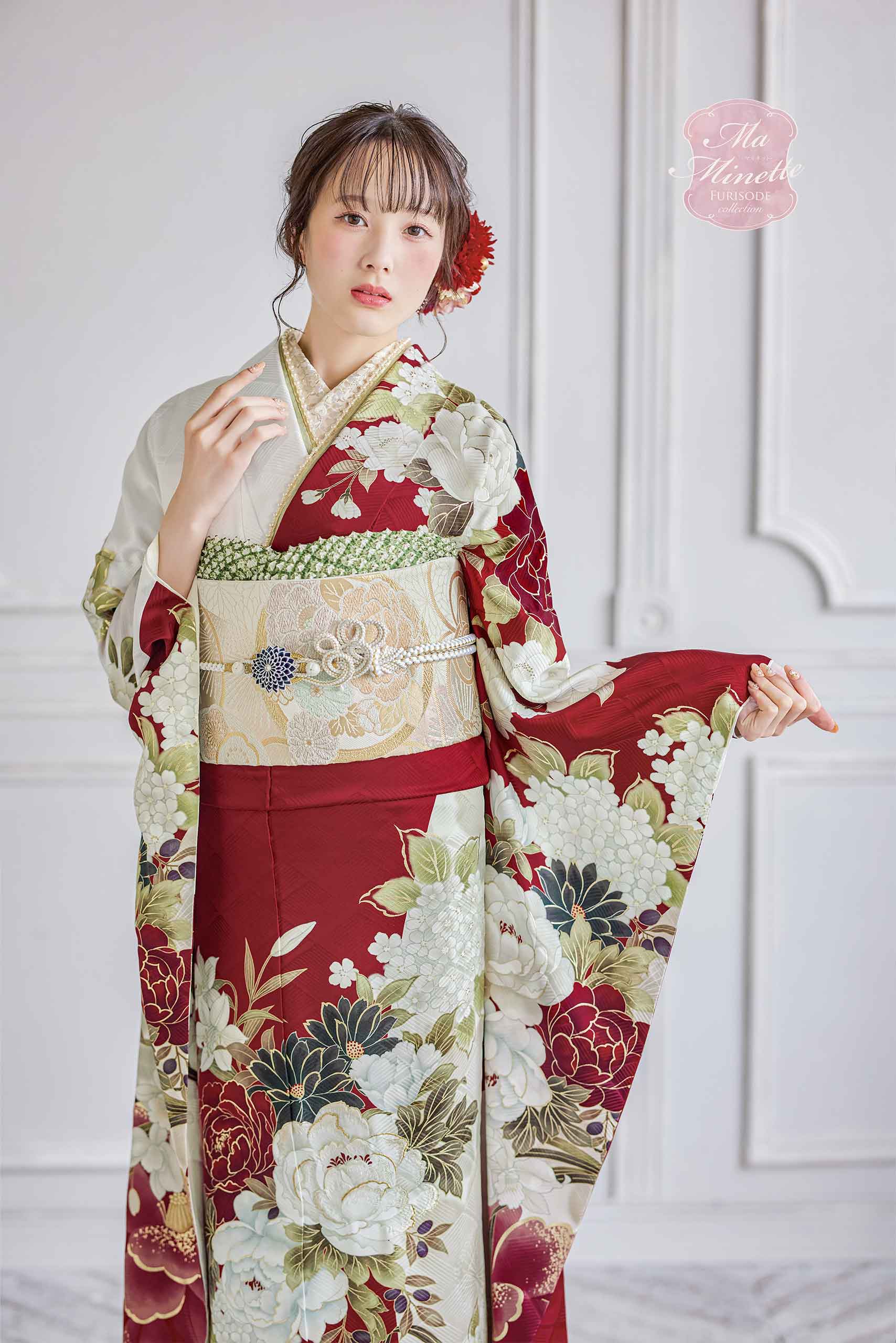 - 写真のコーディネート(帯・帯締め・帯揚げ・重ね襟・半襟・履物・バッグ・ショール等の振袖小物類及び髪飾り・アクセサリー類)は撮影用で、実際のセット内容とは異なります。またコーディネイトの内容により価格が変動する場合がございます。