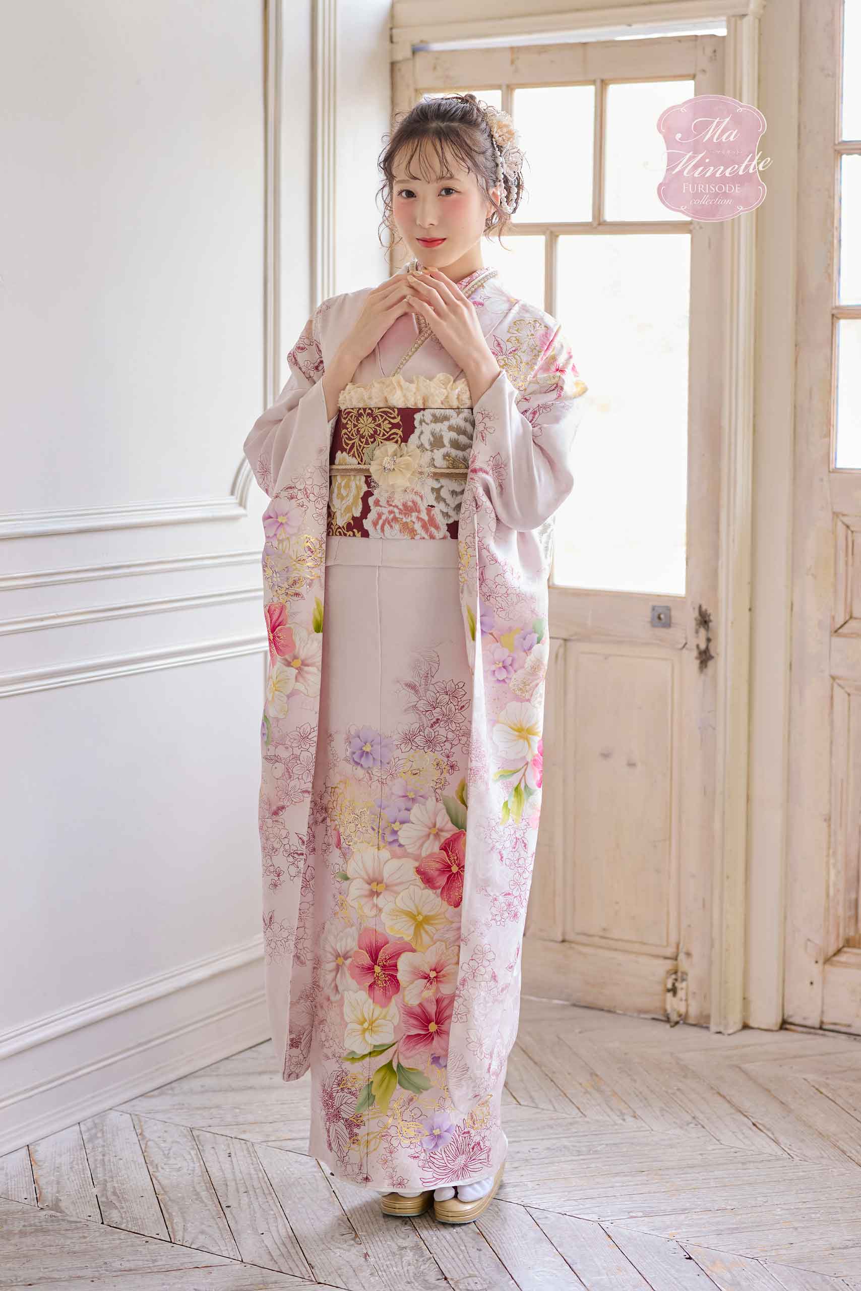 - 写真のコーディネート(帯・帯締め・帯揚げ・重ね襟・半襟・履物・バッグ・ショール等の振袖小物類及び髪飾り・アクセサリー類)は撮影用で、実際のセット内容とは異なります。またコーディネイトの内容により価格が変動する場合がございます。