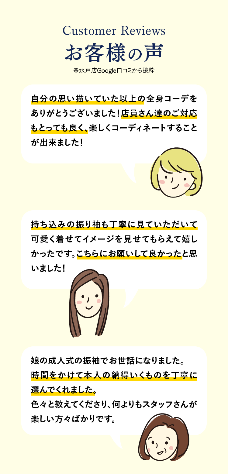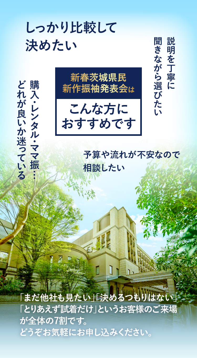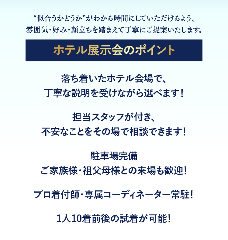 来場時の所要時間は60〜120分※!ゆっくりじっくり選べます!※試着数により異なります。
